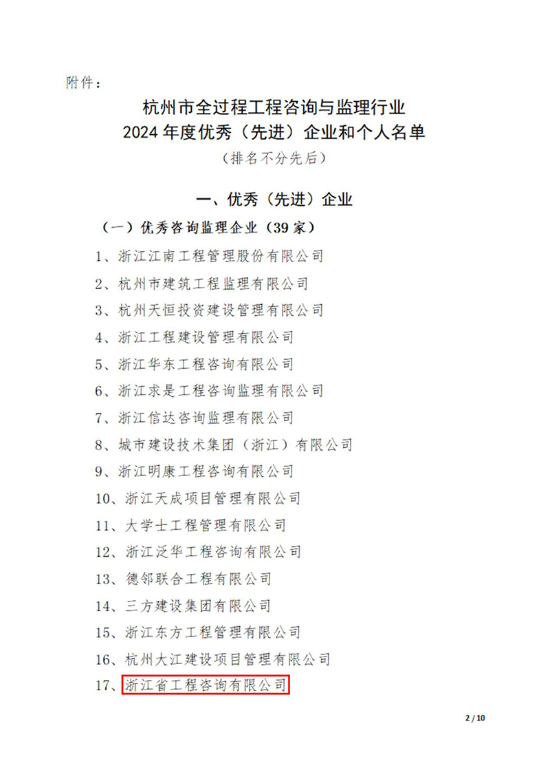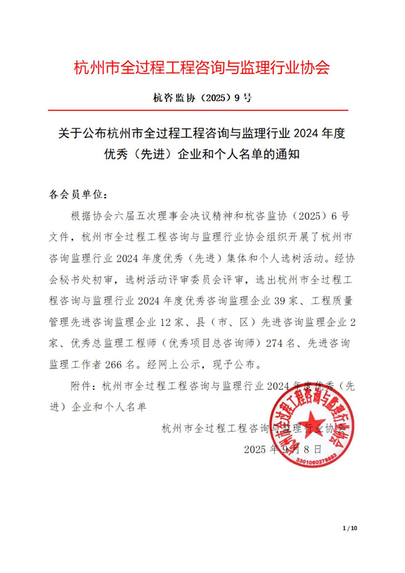 近日,根据杭州市全过程工程咨询与监理行业协会六届五次理事会决议精神和杭咨监协(2025)6号文件,杭州市全过程工程咨询与监理行业协会组织开展了杭州市咨询监理行业2024年度优秀(先进)集体和个人选树活动。经协会秘书处初审,选树活动评审委员会评审,我公司被评为杭州市全过程工程咨询与监理行业2024年度优秀咨询监理企业。