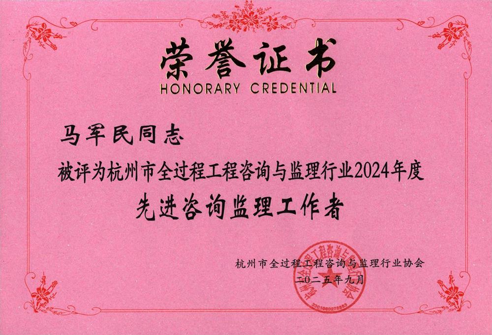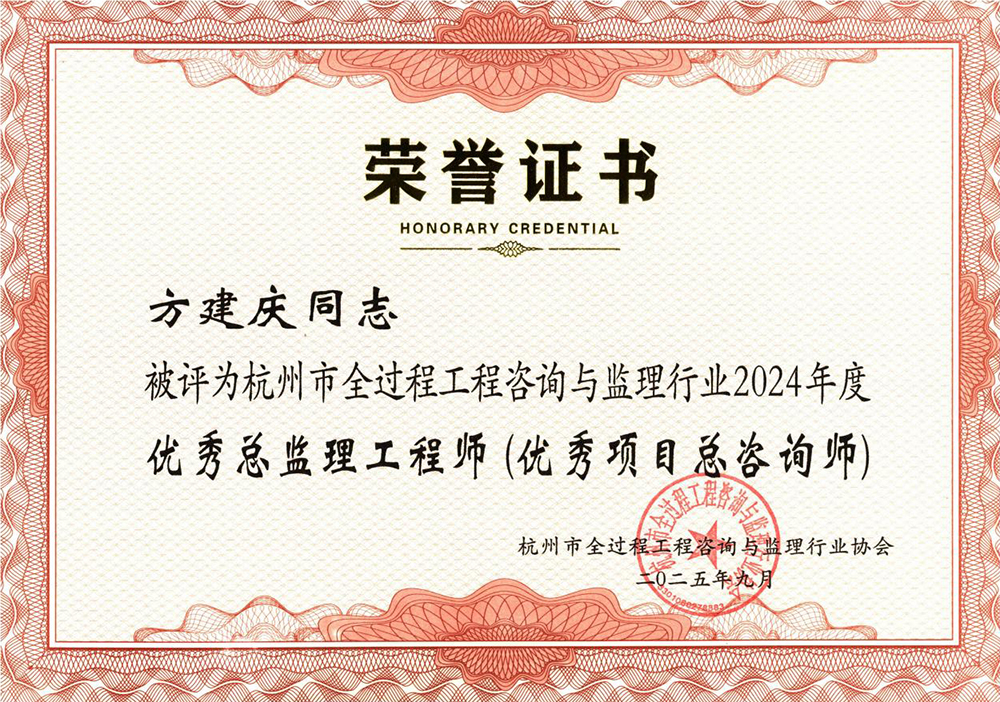 另外,我公司方建庆同志被评为杭州市全过程工程咨询与监理行业2024年度优秀总监理工程师(优秀项目总咨询师),马军民同志被评为杭州市全过程工程咨询与监理行业2024年度先进咨询监理工作者。