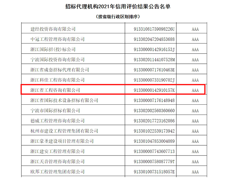 近日,根据《中国招标投标行业信用评价管理办法》,中国招标投标协会公布了招标代理机构2021年信用评价结果,我公司取得信用等级AAA。此次荣誉的取得,是对公司专业能力和服务水平的充分肯定,公司全体员工将再接再厉,诚信自律,规范执业,为行业的健康有序发展贡献自己的力量。