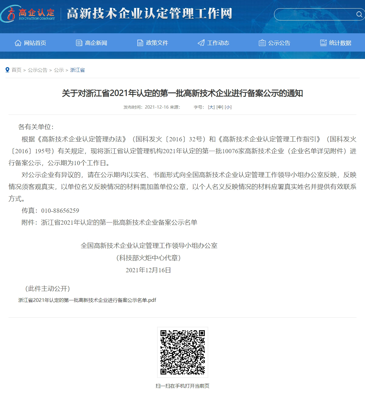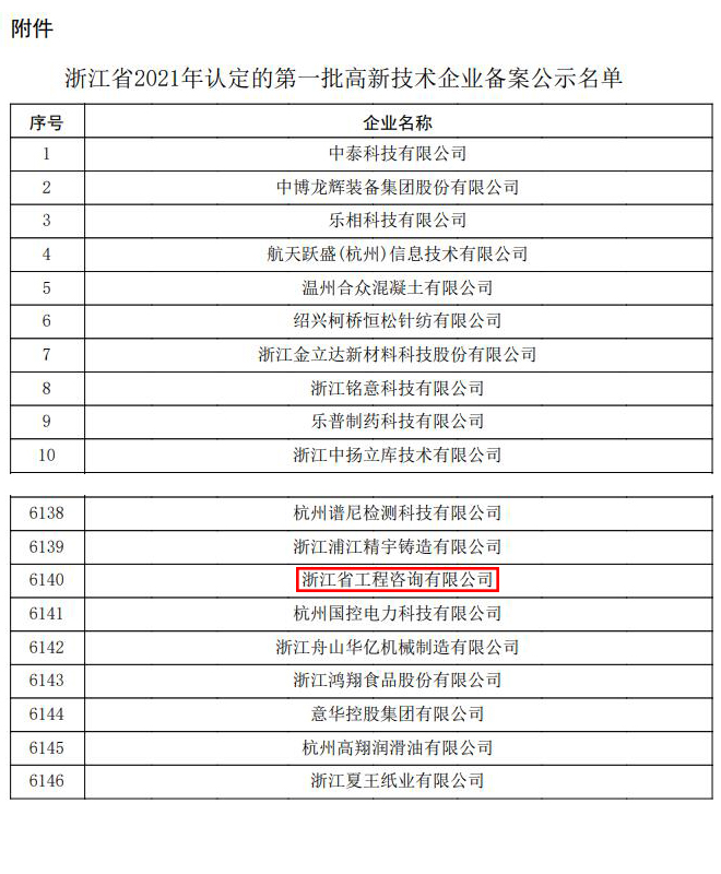 近日,全国高新技术企业认定管理工作领导小组办公室根据《高新技术企业认定管理办法》(国科发火〔2016〕32号)和《高新技术企业认定管理工作指引》(国科发火〔2016〕195号)有关规定,对浙江省认定管理机构2021年认定的第一批高新技术企业进行备案公示,我公司顺利通过本次高新技术企业认定,这是继2018年之后,公司再次取得“高新技术企业”荣誉称号。