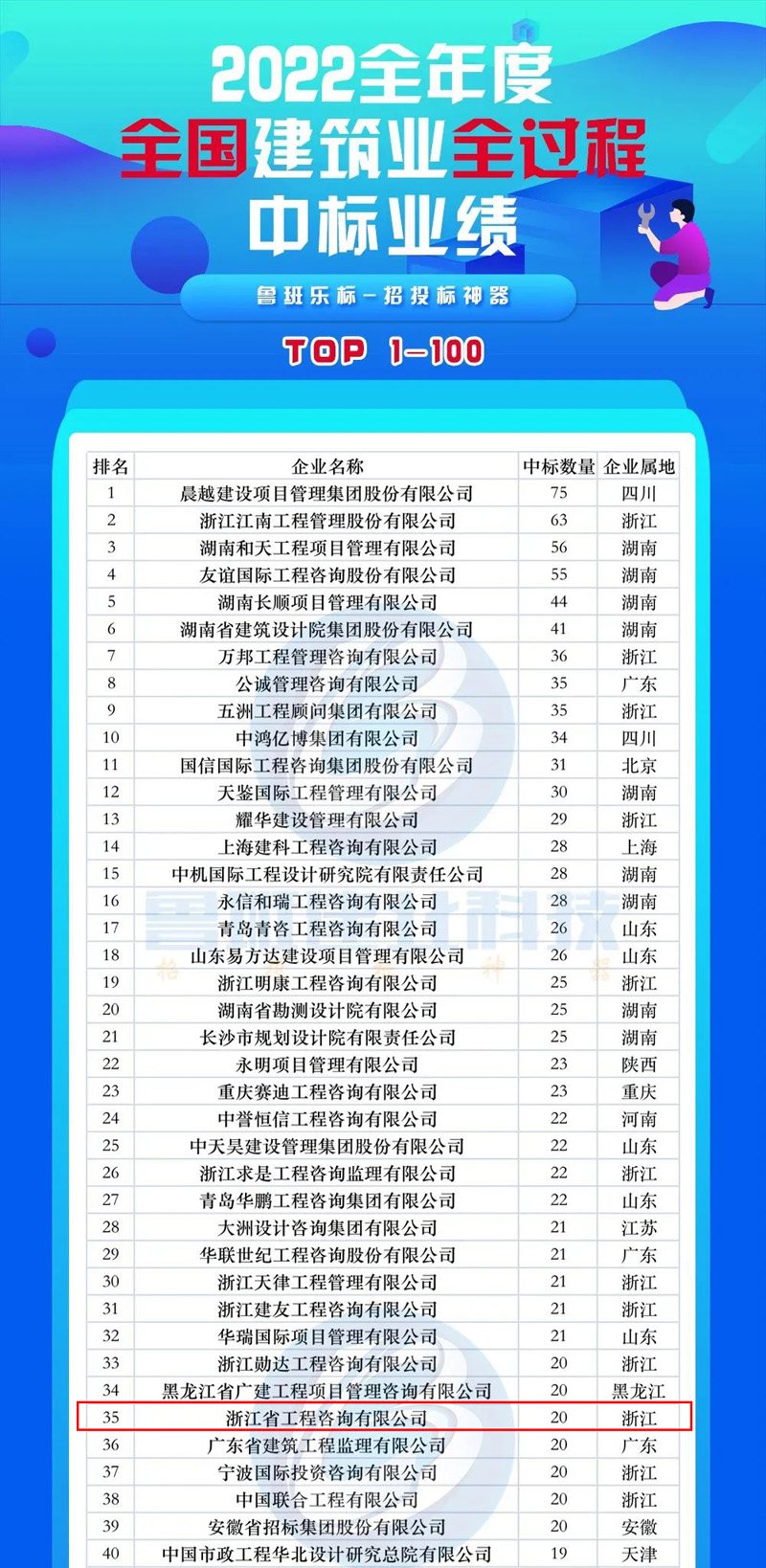 近日,鲁班乐标发布“2022全年度全国建筑业全过程中标业绩100强”榜单,我公司以中标20个项目,位列榜单第35位。