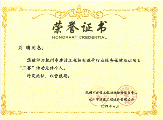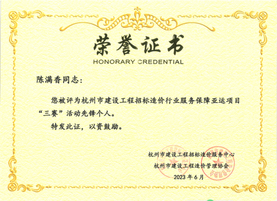 表彰环节,市造价管理协会党委委员、市招标造价中心党总支副书记韩萍宣读了《关于表彰杭州市建设工程招标造价行业服务保障亚运项目“三赛”先进集体、先锋个人的决定》;市招标造价中心党总支委员、副主任秦嘉宣读了《关于表彰2023年造林治沙先进单位的通报》。我公司荣获杭州市建设工程招标造价行业服务保障亚运项目“三赛”先进集体和2023年造林治沙先进单位的荣誉称号。陈满香和刘腾两位同志荣获杭州市建设工程招标造价行业服务保障亚运项目“三赛”活动先锋个人的荣誉称号。