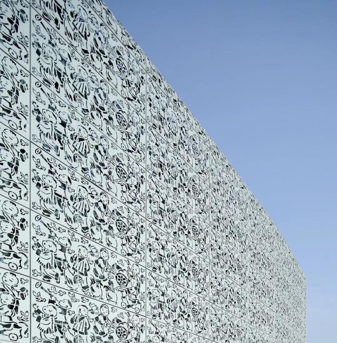 绵竹体育中心利用原未实施完成的旧体育场改造建设,原场地曾在2008年地震中临时存放罹难者遗体,新设计的主旨便被定义为“纪念”与“希望”。主体育场屋面既以双臂“环抱”的姿态守护对逝者的记忆,又以“舞动”的姿态激励生者的勇气。建筑北向广场中心设一处浅水,浅水水底藏一道勾缝,形成裂痕之路,两壁与底部以浮雕的形式记刻地震时期的故事:关于灾难、救助,以及生命的意义。与裂缝垂直方向设置烛台意向的圣火柱,既表达祭奠,又寓意希望。绵竹木板年画享有盛誉,设计选取其中意喻为“希望与丰收”的主题年画镂刻在建筑表皮的穿孔铝板纹样中,光线经外层镂空铝板的孔隙将年画投射在内层玻璃幕墙之上,使得整个新建筑光影层次丰富,地域特色鲜明灵动。