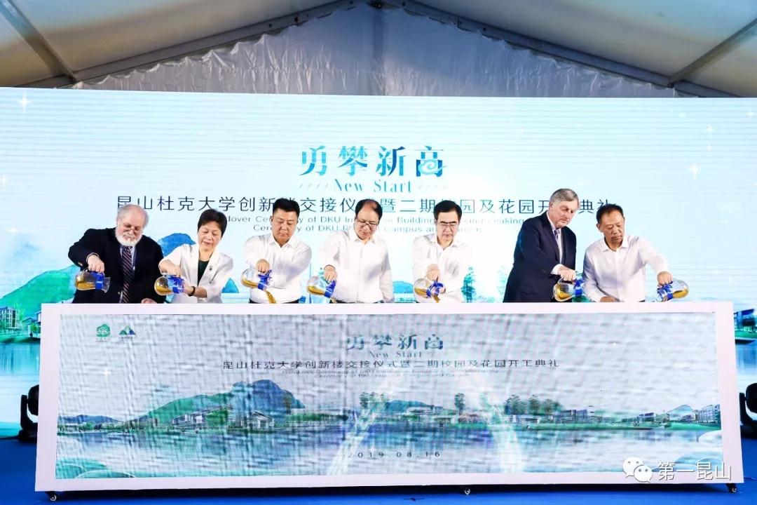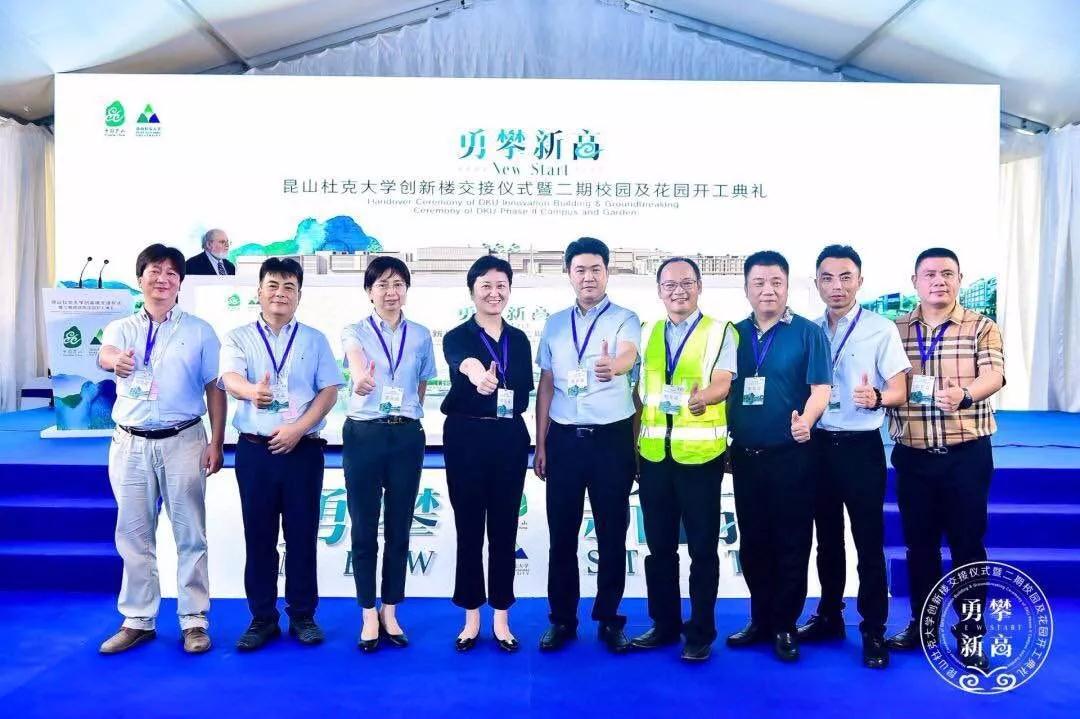 8月16日,昆山杜克大学创新楼交接仪式暨二期校园及杜克花园开工典礼举行。江苏省教育厅副厅长王成斌,苏州市副市长陆春云,昆山市委书记杜小刚、副市长李晖,美国杜克大学前董事、昆山杜克大学理事托马斯•高瑞,美国杜克大学执行副教务长詹妮弗•弗朗西斯、公共事务与政府关系副校长迈克•舍恩菲尔德,武汉大学副校长李斐,昆山杜克大学校长冯友梅、常务副校长丹尼斯•西蒙,以及昆山杜克大学教职工和学生代表等出席活动。中衡设计集团股份有限公司总经理张谨,副总经理、工程公司董事长陆学君,副总建筑师丘琳,以及中衡设计昆山杜克大学项目组同仁等共同参加此次活动。