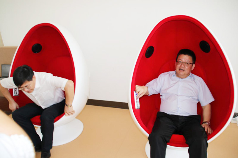金华市委书记陈龙和浙江省对口支援新疆阿克苏地区指挥部指挥长王通林体验图书馆内配备的试听椅